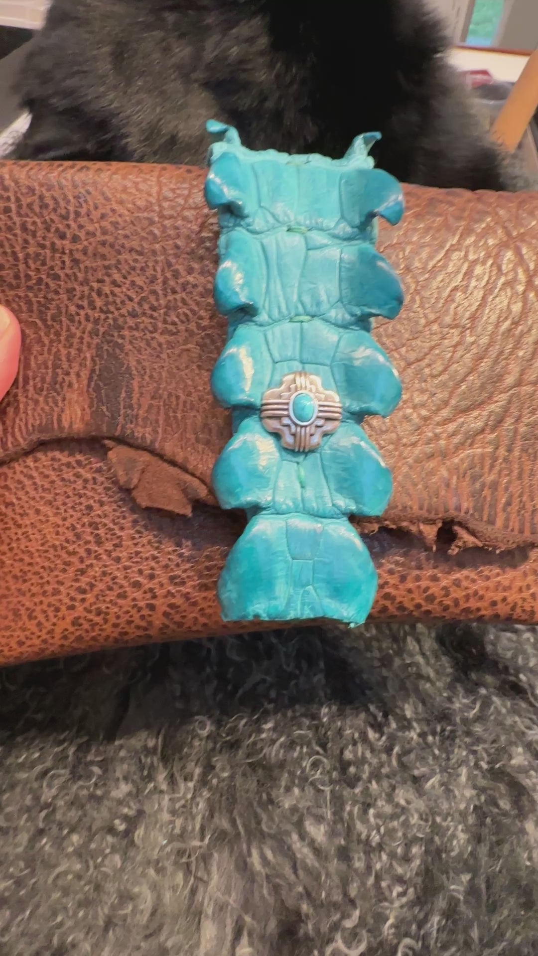 Pure Eye Candy... This one-of-a-kind clutch is made with a thick, yet soft water buffalo leather with organic raw edge flap. It has been trimmed with a vibrant turquoise in genuine crocodile back-strap and finished with a concho with turquoise colored spot. The clutch is hand sewn with our signature stitch.